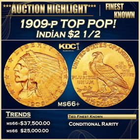 1909-p Gold Indian Quarter Eagle TOP POP! $2 1/2 ms66+ USCG