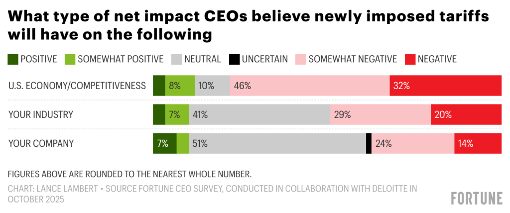That disconnect suggests CEOs may be either overestimating the drag on the macroeconomy—or underestimating how those same pressures could eventually reach their bottom line. In short, CEOs see tariffs as bad for business—just not necessarily for their business.