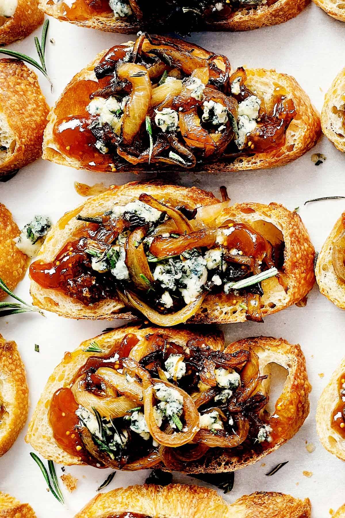 Caramelized Onion Crostini with Fig Jam and Blue Cheese