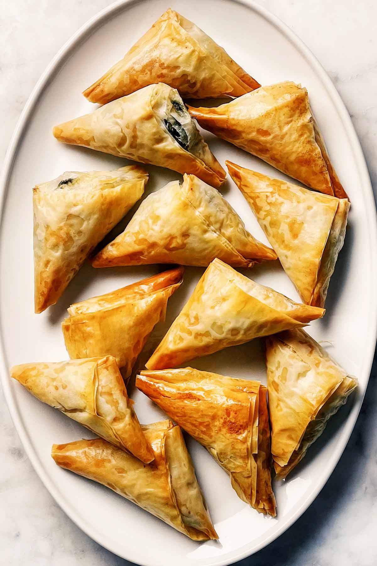 Irresistibly buttery, flaky layered phyllo triangles filled with a bright, tangy filling is a savory two-bite appetizer everyone loves.
