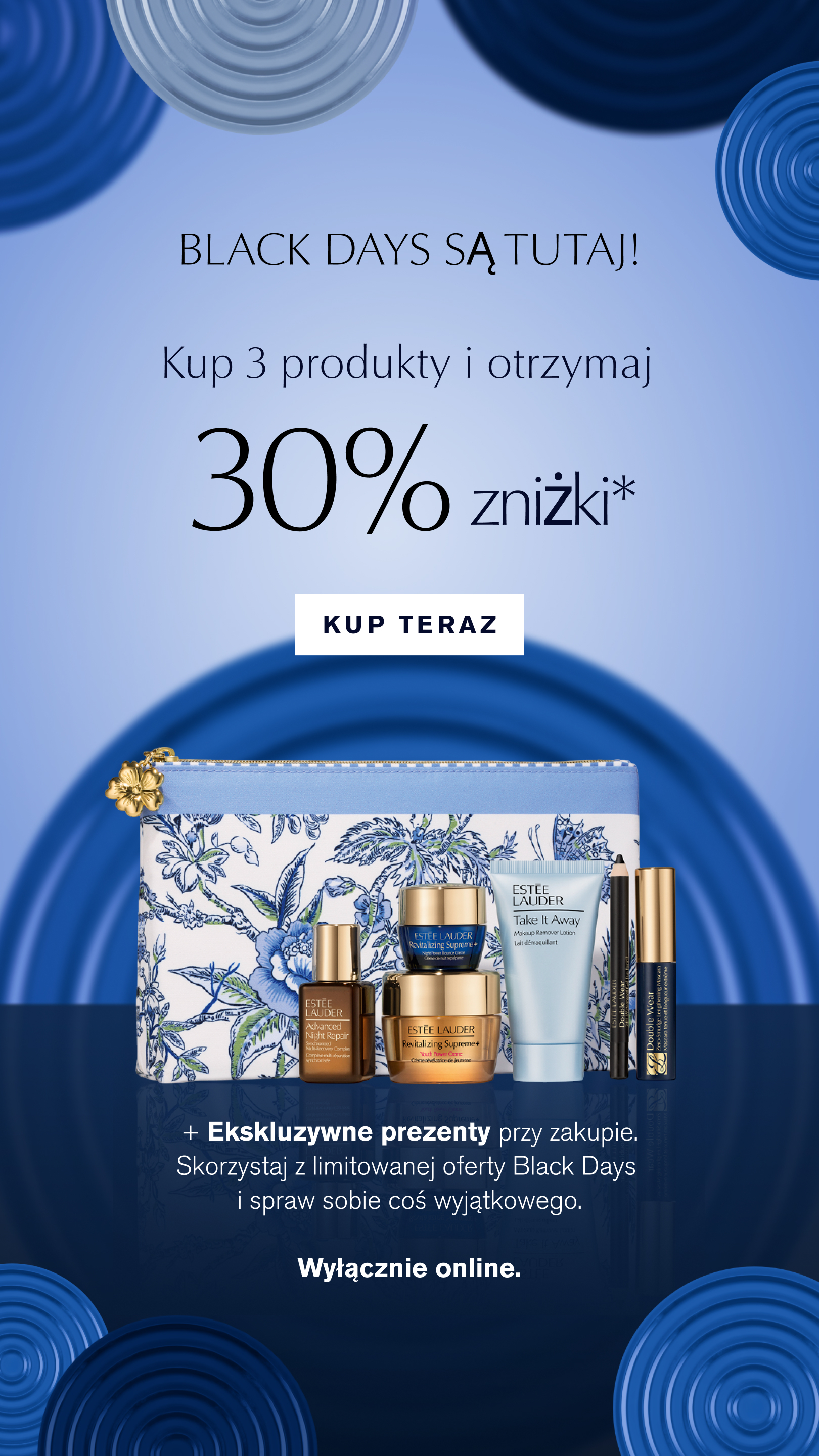 *Oferta ważna do 22 listopada. Oferta obowiązuje automatycznie przy kasie. Rabat nie dotyczy produktów w rozmiarach podróżnych, nowych produktów wprowadzonych na rynek mniej niż 6 miesięcy temu, linii Re-Nutriv ani linii Aerin.