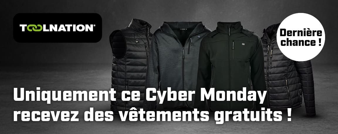 *Le Cyber Monday, c’est aujourd’hui — et cela signifie un avantage maximal pour vous. Passez une commande d’au moins 499,99 € HT et recevez temporairement une veste Toolnation gratuite. Les journées deviennent plus froides, mais vous travaillez au chaud et confortablement.