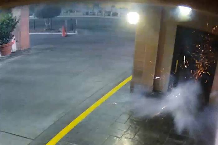 The video shows the suspects placing the device at the door to the restaurant and fleeing before it explodes.
