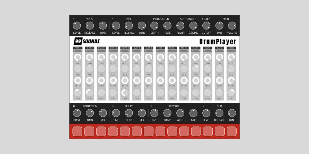 DrumPlayer is a free drum module built using my drum-module template. It includes the usual distortion, delay, reverb, sub, vinyl, and tape effects, plus a multi-LFO — a feature rarely found in drum romplers.
