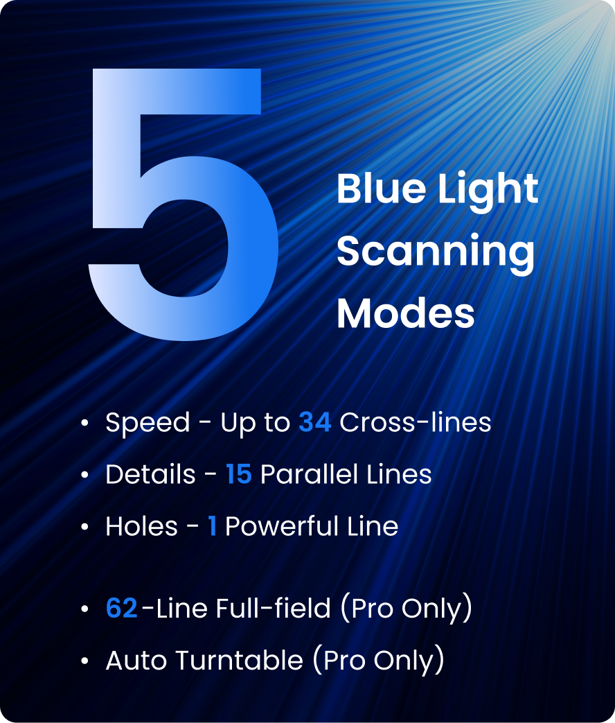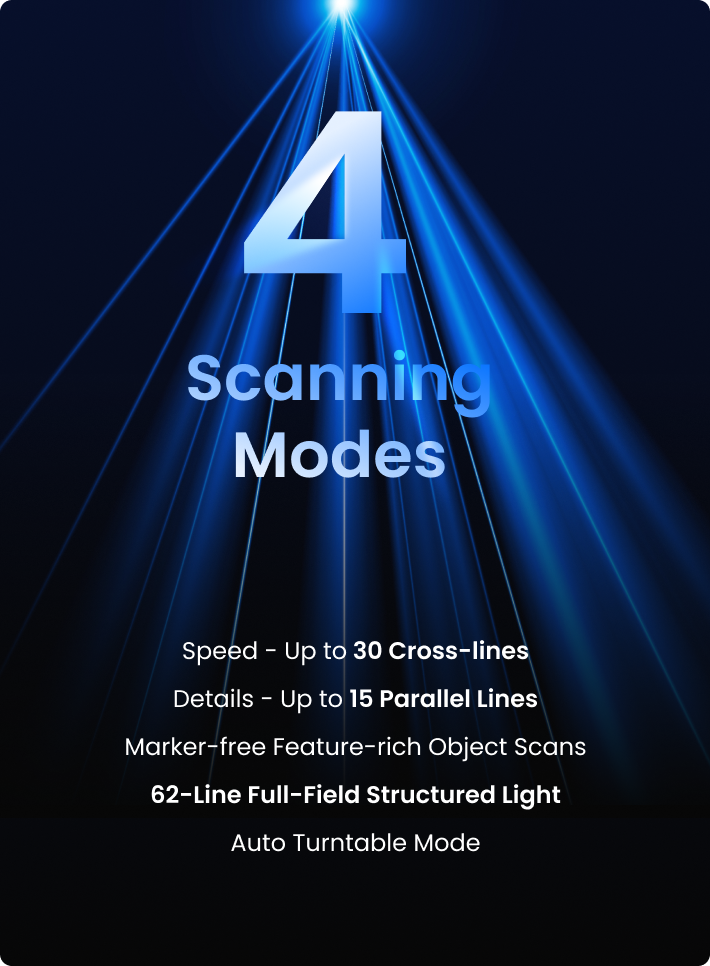 Adaptability: Multiple scanning modes (cross-line, parallel-line, full-field) let you tailor workflows to an object’s size, surface properties, and required resolution. Automated turntables and advanced tracking also minimize manual work, even for tricky surfaces like shiny metals or deep black plastics.
