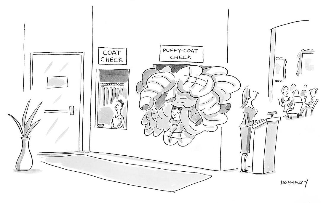 It’s been really really cold where I live, so I thought it was time to share my New Yorker puffy coat drawing. A few thing happened in this past week that are worth paying attention to. Trump is ending his attempt to deploy National Guard troops to Chicago, Los Angeles, and Portland, following a loss at the Supreme Court last week. He stll has troops in Washigton, DC and New Orleans and has not said anything about their status. Over the holidays the Republicans released the transcript of Jack Smith’s Congressional testimony, probably hoping it wouldn’t get noticed with people taking a holiday break from the news. I did not read the transcript. Today I noticed that mainstream media, although initially reporting on it, have seemingly dropped the story. Politico does have a wrap up, which provides some takeaways. Smith was unequivocal about Trump’s guilt. The former special counsel repeatedly leaned into the defense of his probe and expressed confidence that a jury would have convicted Trump if the case went to trial. When asked by both Republicans and Democrats whether his investigations were politically motivated, “Each time Smith was unequivocal: Not for a moment.” And when asked if he thought Trump would come after him, Smith said, “I have no doubt that the president wants to seek retribution against me.” My heart goes out to the families of the mostly young people who lost their lives in the club fire in Switzerland. So very sad. Why does it feel like tragedy is so much worse when it happens to people who were, moments before, so happy? I hope you’re having a nice Friday, and that your weekend will be a good one. Below, I share another installment of Deeper Seeing, something for paid subscribers. It’s an occasional feature of thoughts, drawings or photographs that go a little deeper into something. Today I found myself writing about a small aspect of Mamdani’s inauguration, and something the press does that annoys me!... Continue reading this post for free in the Substack app |
