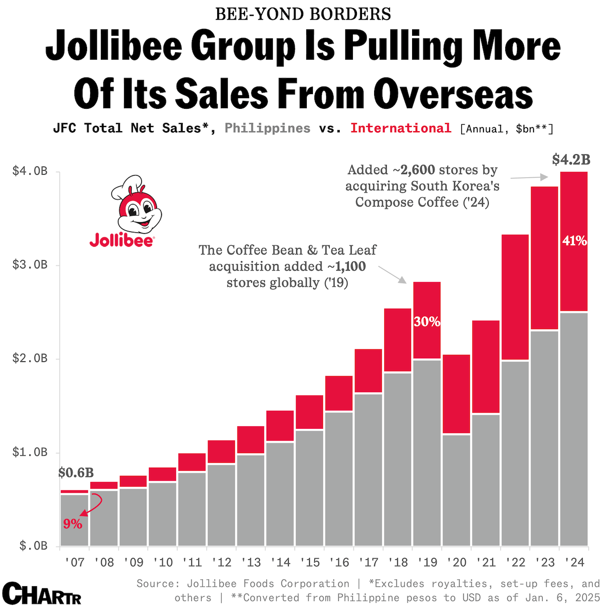 One driver has been a string of caffeinated acquisitions: the group bought The Coffee Bean & Tea Leaf in 2019 and added South Korea’s Compose Coffee in 2024, together lifting JFC’s coffee network to more than 5,000 stores worldwide. Meanwhile, its flagship Jollibee brand — still responsible for around half of total sales — is growing faster abroad than at home, with same-store sales growth in North America, EMEA, and China all surpassing the Philippines in 2024.