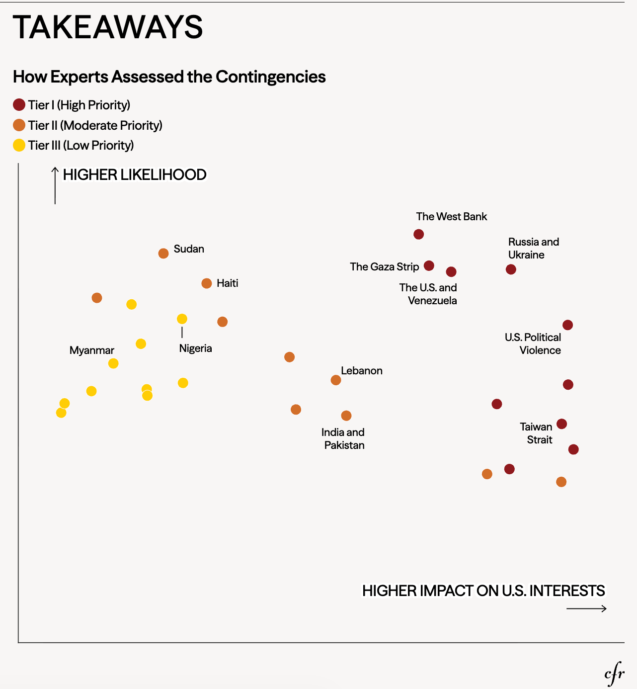 Experts further warn of renewed armed conflict between Iran and Israel; a disruptive, artificial intelligence–enabled cyberattack on U.S. infrastructure; a cross-strait crisis between China and Taiwan; and resumption of North Korean nuclear weapons tests.