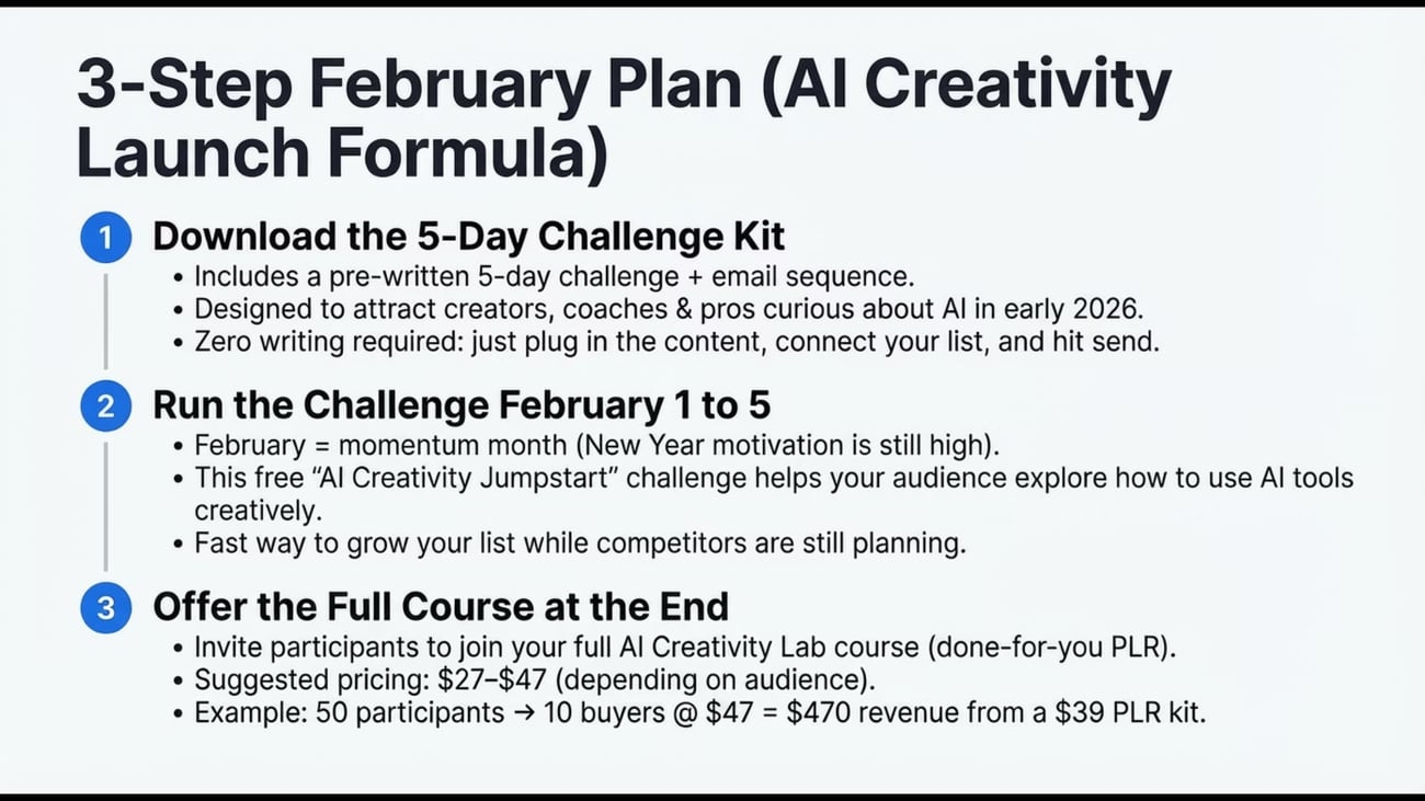 The AI Creativity Lab comes with a 5-day challenge and email nurture sequence. Both are designed to attract coaches, consultants, and creators who know they need to master AI without losing their creative edge.