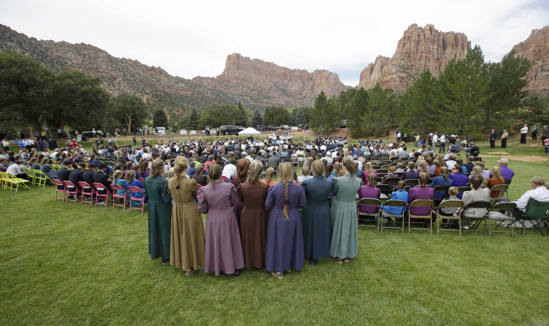 In this Sept. 26, 2015, file photo, community members from Hildale, Utah, and Colorado City, Ariz., attend a memorial service in Hildale for the victims of a flash flood. (AP Photo/Rick Bowmer)