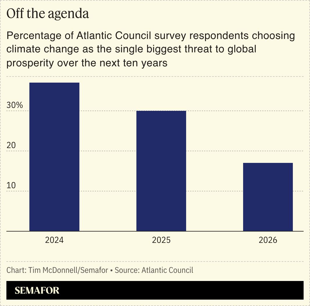Fewer geopolitical experts see climate change as an urgent global security threat, but many still expect to see conflict over water access in the near term. In an Atlantic Council survey of nearly 450 experts, shared first with Semafor, 80% expect the world to become hotter over the next decade, and fewer than half think global greenhouse gas emissions have peaked. But whereas, two years ago, half of this group of experts expected climate change to be the chief driver of global political cooperation, now less than 20% share that view, and only 17% see climate change as the top threat to global prosperity. Yet 64% think a war over access to fresh water is likely before 2036. Meanwhile, in part due to the global shift from fossil fuels to alternative energy sources, a majority of experts said they expect China to be the world’s dominant economic power in the coming decade. |