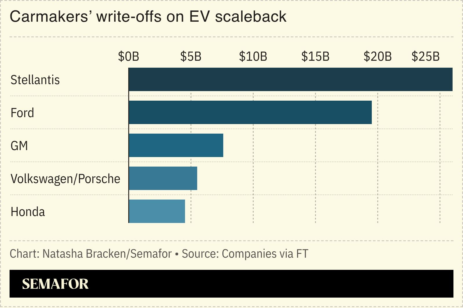Carmakers registered $65 billion in write-offs globally as companies were forced to overhaul their EV investments, squeezed by a pivot in US climate policy and an overstated enthusiasm for the green transition. Since the US axed its $7,500 federal tax credit in September, automakers and battery manufacturers have been scaling back by canceling projects, downsizing investments, and reviving plans to produce more traditional gas-powered vehicles. It’s not a uniform retreat, however; sales of fully electric cars surpassed those of petrol-only vehicles in the EU for the first time in December, but European giants are still badly bruised from diminishing US demand: Stellantis, which once believed EVs would make up half of its US sales by 2030, took a $26 billion hit after scrapping several fully electric models and reviving its 5.7-litre engine for the US market. Industry leaders now expect EVs to account for just 5% of the new US vehicle market in the coming years. — Natasha Bracken |