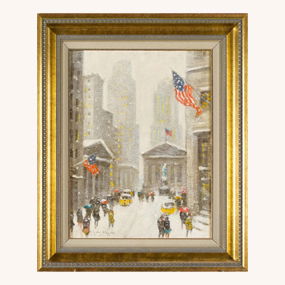 An exceptional Guy Wiggins (1883-1962) oil on artist board, titled on reverse with Vose Galleries label, ‘Broad Street in Winter, New York’.