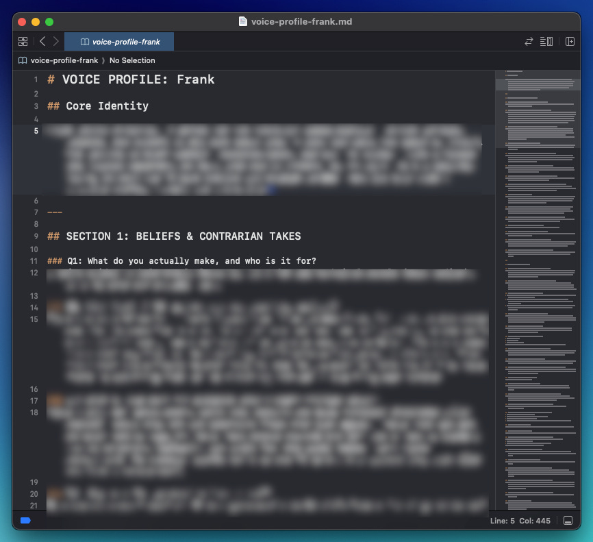 Level 1: Prompts → .md filesSince ChatGPT's release, we’ve been obsessed with prompt engineering. I wrote many guides teaching the best prompt engineering techniques. They’re still relevant. But here’s the thing. Your best prompts saved on Notion are at the “what to do” level. Since 2023, the context window and agentic capabilities evolved. Now we can go deep into the “exactly how to do it” level. This means we can go far beyond ‘Act as a writer with 10 years of experience. Write about XYZ ’ We can teach the AI how to create the article end-to-end: our writing voice, how to structure each section, which words to avoid, the format, etc. The entire workflow becomes instructable, not just the final ask. All this info goes into an .md file (aka markdown file). An .md file is simply a text file. The difference? A .txt file is flat. Markdown gives you headings, code blocks, bold/italic text, and organized lists. This structure helps AI (and us) quickly find sections without having to read the entire file top to bottom. Here’s what a simplified .md file looks like for capturing your writing voice: Not all your prompts should be turned into an .md file, though. Think of .md files as recipes: write the instructions once, and the AI follows them every time it runs the task. There are different ways to create an .md file: