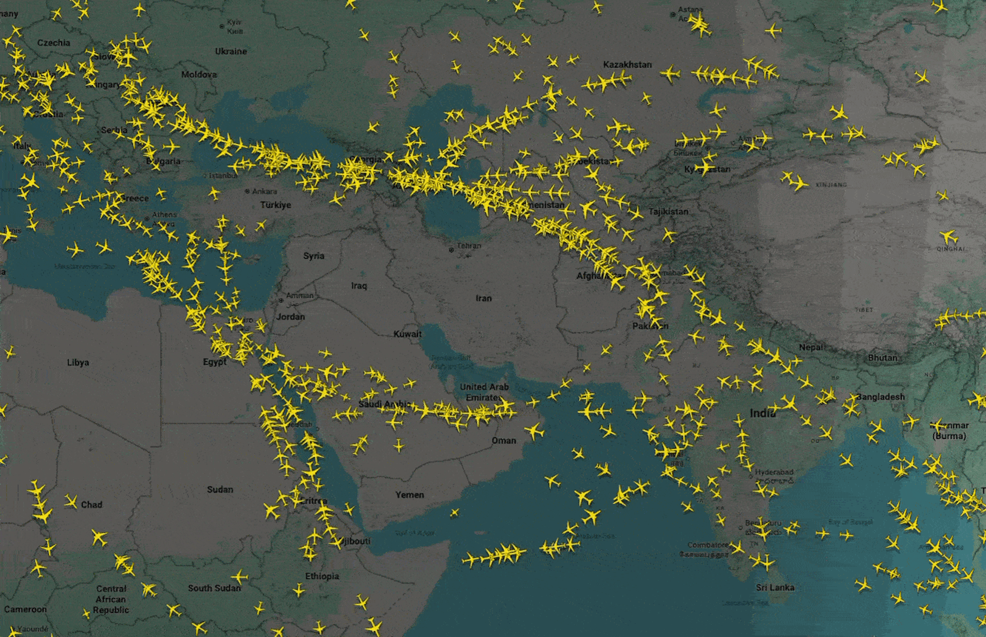 Aircraft are avoiding Iran, Iraq, United Arab Emirates and Syria airspace.