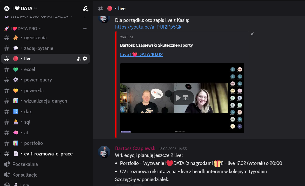 Masz pytania do I❤️DATA? Przyjdź o 20:00 na LIVE Q&A i zadaj je na żywo. Odpowiem na wszystkie wątpliwości na temat czasu, kosztów, rat i narzędzi: Ile czasu trwa program I❤️DATA? Ile czasu potrzebuję poświęcić tygodniowo? Ile kosztuje I❤️DATA? Czy program to to samo co kurs EXPERT? Jak działają raty? Jaką formę płatności na stronie wybrać, aby zapłacić na raty? Co, jeśli się rozmyślę po pierwszej racie? Ile kosztują narzędzia do kursu? W jakim programie można stworzyć takie interaktywne portfolio? Czy można przejść przez Wyzwanie Wizualizacja lub Automatyzacja jeszcze raz? Czy trzeba być ekspertem w Excelu czy można być początkującym? Czy można ofertę dla pracodawcy po angielsku? Czy są materiały po angielsku? Jak wygląda platformy, społeczność Discord i live'y?