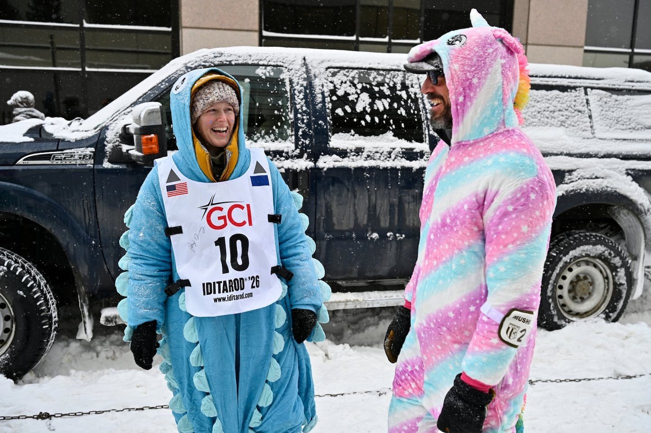 Iditarod musher Paige Drobny, left, and her husband and kennel partner Cody Strathe celebrate ceremonial start day in costume. (Marc Lester / ADN) |