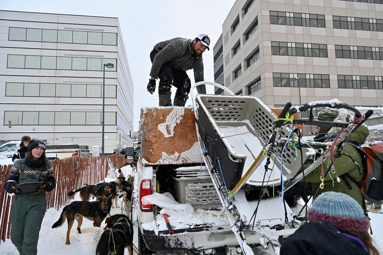 Musher Lauro Eklund unloads his sled downtown. (Marc Lester / ADN)