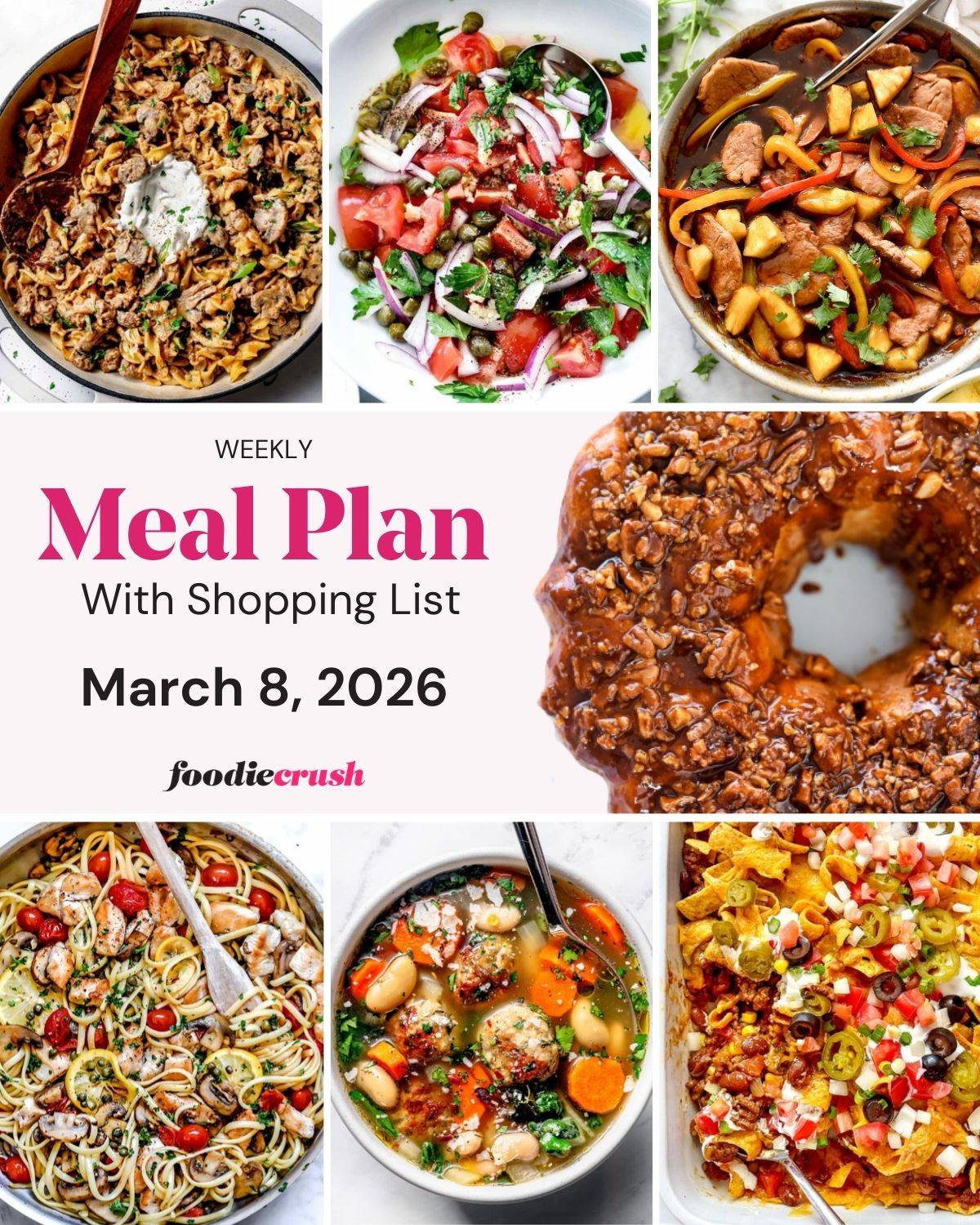 This week's meal plan includes: turkey meatball soup, Frito pie, healthier sweet and sour pork, hamburger stroganoff, chicken piccata pasta, and monkey bread for weekend brunch!