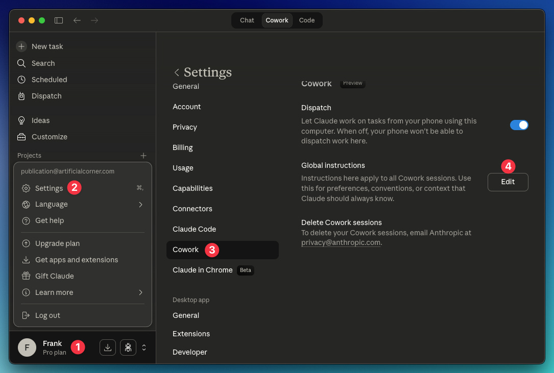 Cowork doesn’t need more prompts. It needs a systemIf you come from the chat world, this makes sense: write a better prompt, get a better result. That jump looks small. It isn’t. Because the moment your way of working lives in files, Cowork stops starting from zero every time. When that happens, the results stop feeling generic and start feeling like “this thing already knows how I work.” Quick Cowork Recap: InstallationTo use Cowork, you need to download Claude for desktop: Go to claude.com/downloads → download Claude Desktop → install it → sign in Once it's installed, select Cowork. That's it. You're in. Quick setup: Add Global InstructionsGlobal instructions is where you set the default behavior Cowork should bring into every session. Do this: Open profile menu → Settings → Cowork → Add your Global Instructions → Save Copy these global instructions: |