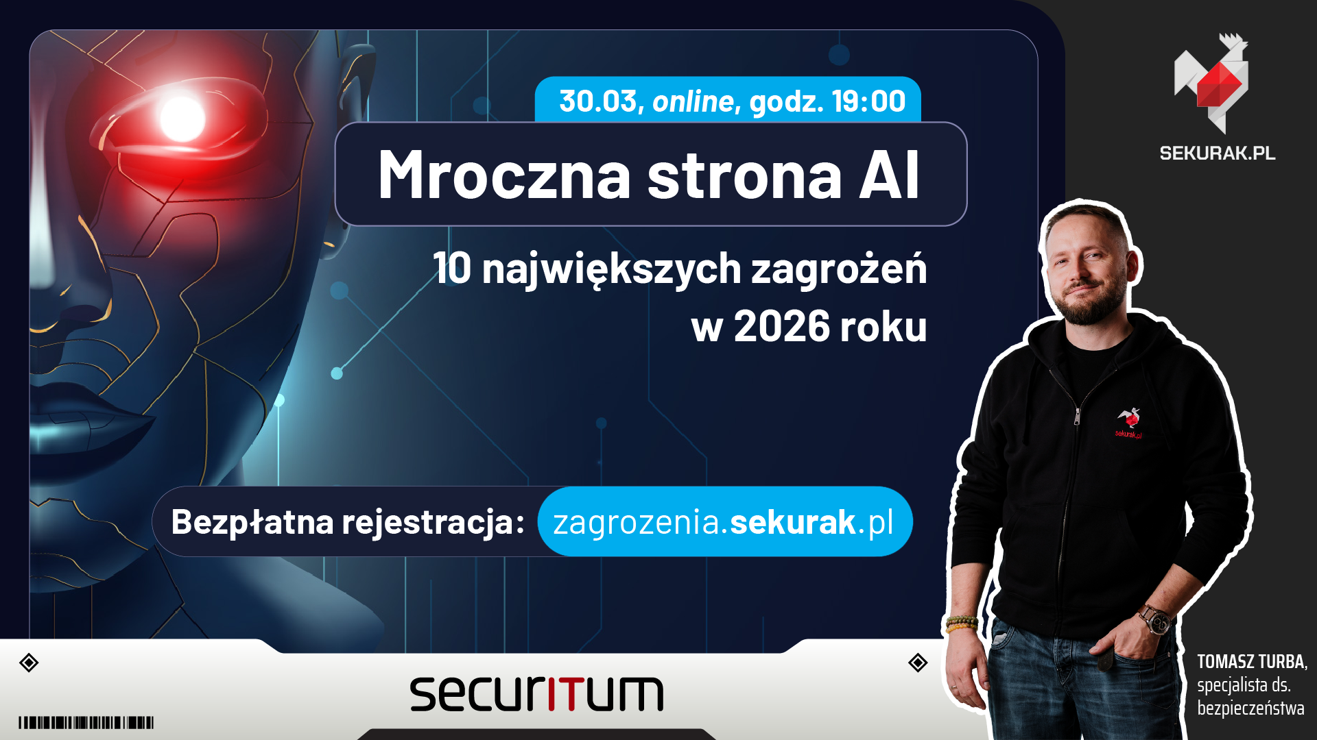 Zapraszamy na szkolenie Mroczna strona AI — poznaj 10 największych zagrożeń w 2026 r. z Tomkiem Turbą z ekipy Sekuraka. Specjalnie dla Was mamy zniżkę -100% na bilet z certyfikatem. Wystarczy kliknąć w link, rabat naliczy się sam.