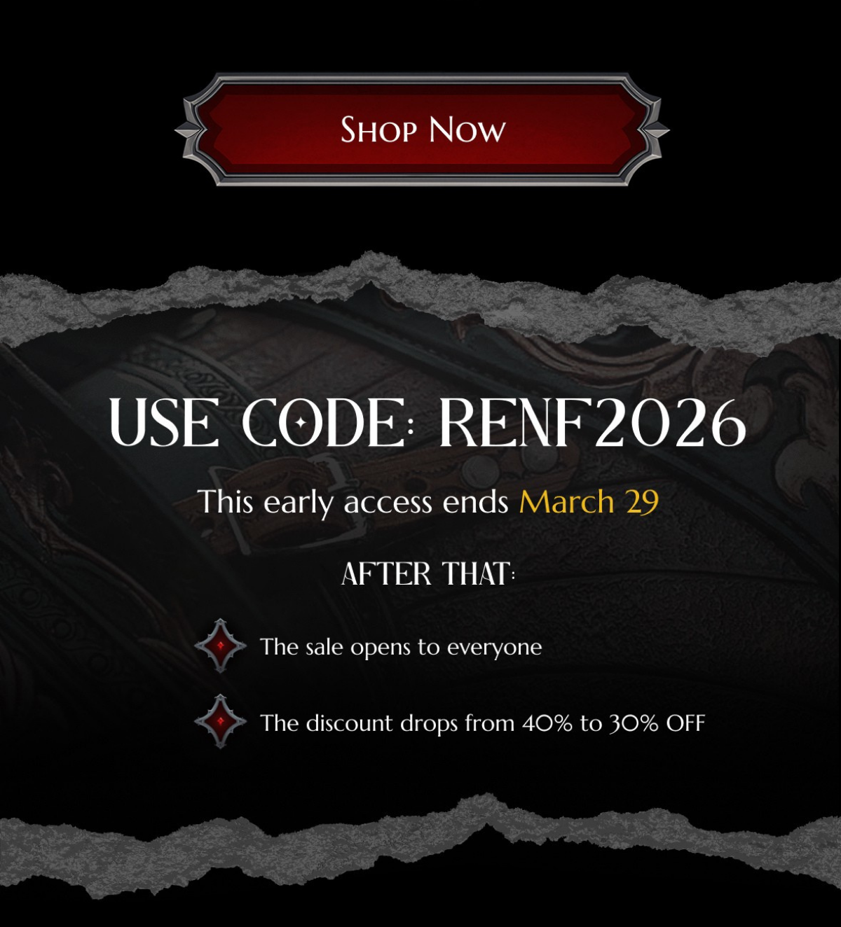 This sale was meant as early access for our email list so you have enough time to start crafting your armor and get everything ready for the Ren Faire season.