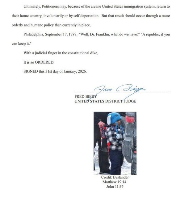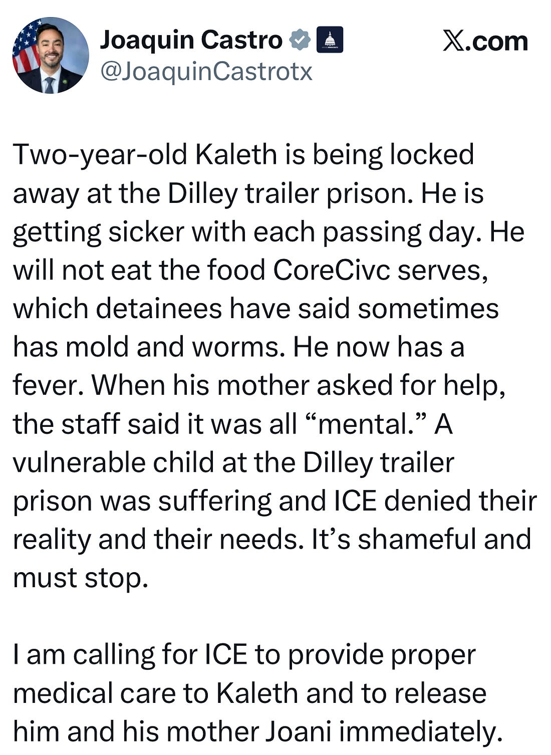DOJ filed a notice of appeal on Wednesday, signaling that it will try to undo a federal judge’s order that requires the release of 5-year-old Liam Ramos, whose photo put a human face on Trump’s mass deportation policy and busted open the myth that it was about getting violent criminals off the streets of Minneapolis. Liam’s Dad, Adrian Conejo Arias, an asylum applicant, was detained and then released with his son. Although the two were seized in Minneapolis, The Justice Department filed its notice of appeal in federal court in Texas, because the two were held in the Dilley detention facility in there. The appeal goes to the conservative Fifth Circuit Court of Appeals. The conditions in Dilley are shamefully inhumane with food contaminated by bugs, failure to provide essential medical care, and unsanitary conditions being well-documented. The federal judge who ordered the father and son released after their lawyers filed a habeas petition noted the complexities of the situation in his brief order. He noted the pair might still be forced to return to their country in origin because of our “arcane” immigration system, but that if it happened on his watch, they would at least receive due process. “That result should occur through a more orderly and humane policy than currently in place,” Judge Fred Biery wrote, before referencing Ben Franklin’s comment, “a republic, if you can keep it.” The federal government is using its resources to try and send 5-year-old Liam Conejo Ramos back to detention in a facility it can’t be bothered to make safe. No one in this administration would spend five minutes or eat a single meal in those conditions, yet today, Trump’s There is a cost to tying up investigative and prosecutorial resources. ProPublica got the data: “In total, the DOJ quietly closed more than 23,000 criminal cases in the first six months of President Donald Trump’s administration, abandoning hundreds of investigations into terrorism, white-collar crime, drugs and other offenses as it shifted resources to pursue immigration cases.” You can make time for cases like Liam Ramos’ when you abandon public corruption prosecutions. Apparently, this DOJ did. It’s hard to report on people who are being held in custody. The journalists who put a human face on this story and elected officials like Joaquin Castro who insisted on doing their jobs did the work of democracy here. Even Alabama Senator Katie Britt, albeit fleetingly, saw the people behind the ugly label “illegal immigrants” when America got to see Liam in a hat and backpack they could easily envision their own children in. We need to keep telling immigrants’ stories; putting real faces onto people who could easily remain faceless. They are all individual stories. These are people with futures ahead of them. Not everyone may be entitled to remain in this country, but that doesn’t mean they should be warehoused in disease-ridden facilities with rotten food. As for Liam and his Dad, they came to this country seeking asylum. Asylum is a fundamental human right that affords people fleeing persecution or danger the right to request protection and legal residence in another country. It’s provided for by both international law (the 1951 Refugee Convention) and U.S. laws. Protecting their rights seems essential to ensuring we keep our own. Like so many other things, it’s up to the courts. We’re in this together, Joyce |