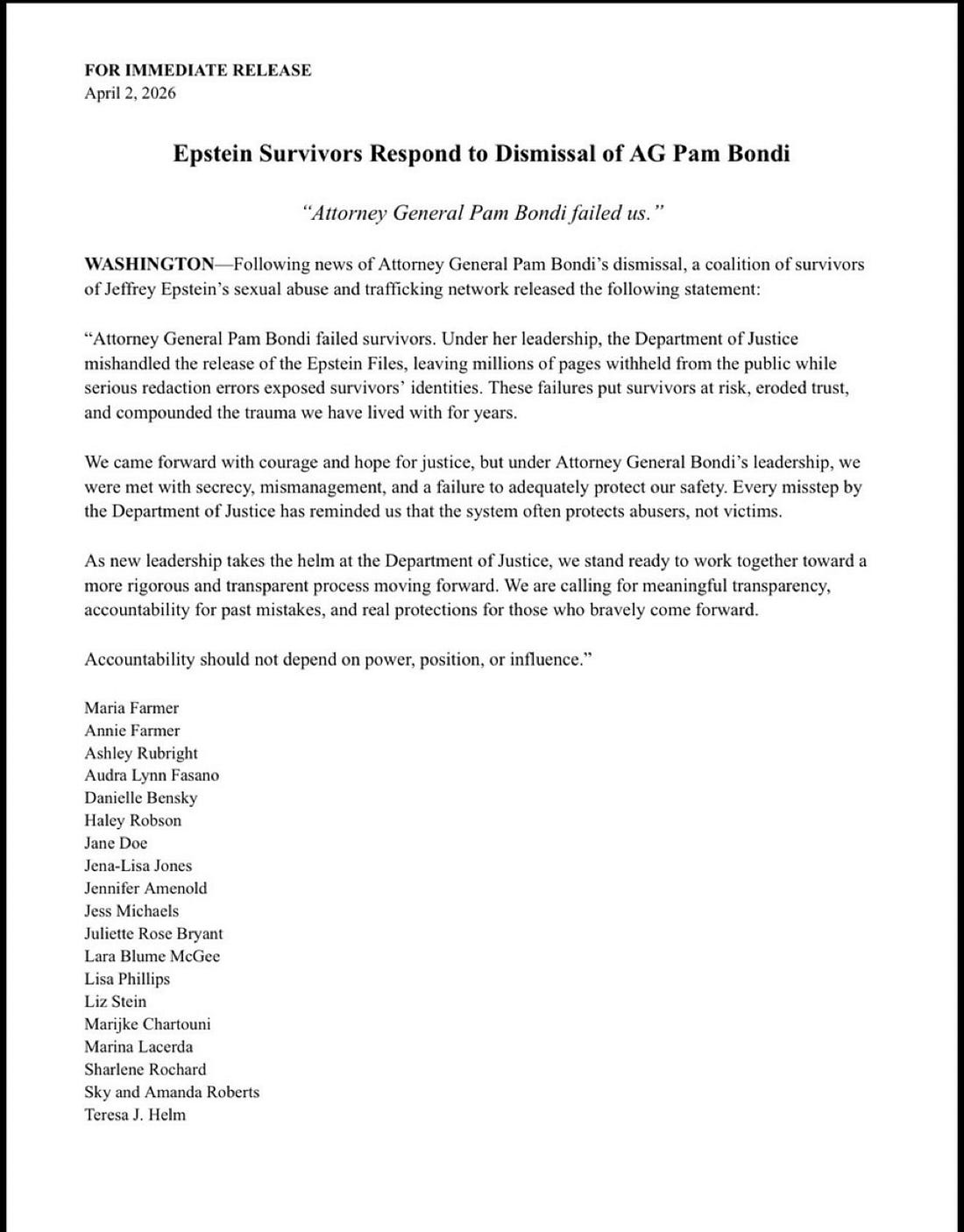 Trump fired Pam Bondi, apparently on Wednesday night, before addressing the country about the war in Iran. But he still has an Epstein problem. Firing Bondi will not make that go away. Firing Pam Bondi doesn’t change the sweetheart deal Ghislaine Maxwell got in exchange for saying she never saw Trump doing anything wrong. For all we know, there’s a pardon or a commutation in the works, too. Bondi has to have taken the job of Attorney General knowing what was in store for her. She was cast in the role of the Trump 2.0 Jeff Sessions and her fate was much the same as his, although Trump was a little nicer and her neck got to the chopping block earlier than Sessions’ did—21 months to Bondi’s 14. To take the parallel further, Todd Blanche, who will become the acting Attorney General, takes on the role played by Matthew Whittaker in the first Trump administration. You may not remember Whittaker, and if you do, it may be because he was involved in the sale of “masculine toilets.” He was a former U.S. Attorney from Iowa who became acting Attorney General but never received the nomination for the top job. If the past is prologue, the important question now is who will be the Bill Barr of the second Trump administration? Names have already surfaced and more are likely to. They are all Trump loyalists of the first order. Trump’s EPA director, former congressman Lee Zeldin, D.C. U.S. Attorney Jeanine Pirro, Missouri Senator Eric Schmitt (who previously took himself out of the running when Bondi was nominated), and failed New Jersey U.S. Attorney and former Trump lawyer Alina Habba. The most loyal of the Trump loyal. It’s difficult to understand why any credible lawyer would want to serve this president in this position. All the priorities are on the table: prosecute enemies, give friends a pass, forget about justice, and just do whatever the president wants. That means the ultimate nominee should face extraordinary scrutiny. Bondi was eminently fireable based on objective criteria. But the conduct most former prosecutors would find highly objectionable is probably what Trump liked most about her: the heavy theatrics when she testified before Congress, her willingness to indict a former FBI director and a state attorney general on charges too flimsy to withstand scrutiny in court, and her readiness to investigate senators and members of Congress on specious grounds. So why fire her, and why now? Many people suggest it was her handling of the Epstein files, which was clearly a mess. Or could it be last week’s reporting from Carol Leonnig, which revealed some of what Trump has fought hard in court to keep private, namely details of the documents he retained during the classified documents investigation, which we discussed here? Trump could have found a reason to fire Bondi on virtually any day of her time in office. So it’s interesting that it happened on this particular timeline. Whatever the reason it happened now, this outcome was preordained from the moment she took office. Donald Trump routinely asks his attorneys general to stretch and bend, if not break, the rule of law. Bondi was compliant. When asked to prosecute the president’s enemies, she did. The disastrous indictments of Jim Comey and Letitia James were two examples. When it came to the president’s friends, she appears to have complied as well. The investigation into Border Czar Tom Homan, involving allegations that he took a $50,000 cash bribe in a Cava bag, simply disappeared. Every public servant has personal red lines. For Jeff Sessions, it was appointing a special counsel because he had a conflict of interest. For Bill Barr, it was leaving office before Donald Trump escalated his efforts to overturn the election on January 6. We do not really know what Pam Bondi’s line would have been because she never invoked it. Instead, the president fired her. Bondi’s departure is, unfortunately, no cause for celebration. Donald Trump still gets to choose the next attorney general. He will likely look not for an experienced federal practitioner, but for someone who is compliant, loyal, and willing to do what no good attorney general should in order to serve him and maintain proximity to power. The Epstein survivors explained their view in a brief statement on Thursday. At the height of public interest in the Epstein files, they appeared to be a major concern for Trump. In some ways, it has worked; they no longer dominate the news cycle. That tells us what we need to know. The job is about protecting Trump, and whoever suppresses the Epstein files succeeds. It is not about justice. My friend Preet Bharara got it exactly right. At her confirmation hearing, Bondi refused to say Biden beat Trump. When we discussed it, just over a year ago, I wrote, “Make no mistake about it, Pam Bondi is a Donald Trump loyalist. And, if you won’t say no to Donald Trump when it comes to the Big Lie, what will you say no to him about?” Apparently, not much. Thanks for being here with me at Civil Discou |