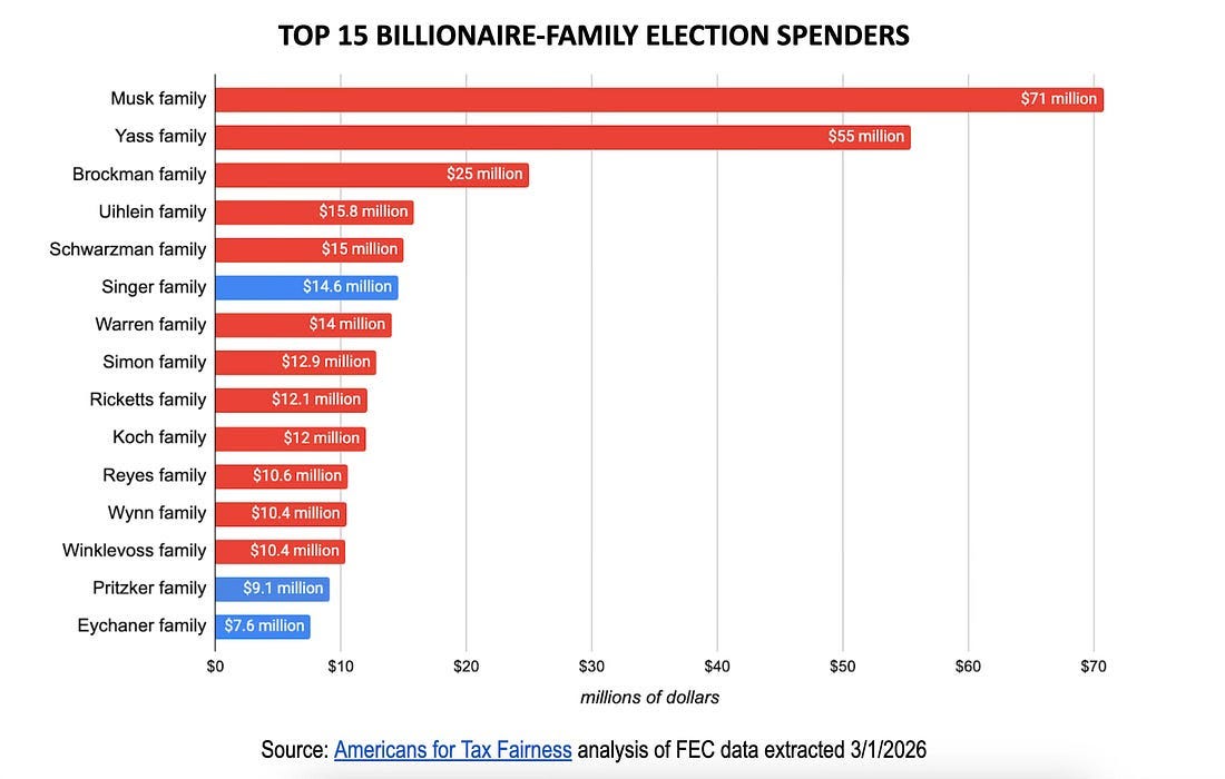 Friends, It’s important that we demonstrated against Trump’s assertion of royal powers. It’s at least as important to follow the money — and learn the identities of America’s billionaire royalty who crowned Trump in the first place. They’re now spending another regal fortune to keep Congress under his control. Today I’m going to name names. As of March 1, according to a new report from Americans for Tax Fairness, the 50 biggest-spending billionaires in American politics had already contributed over $433 million to the upcoming midterm political campaigns. Not surprisingly, 80 percent of this haul is in support of Republican candidates or conservative issue groups. Given how early we are in the process, and how contributions tend to accelerate closer to Election Day, 2026 will almost surely set a new record for billionaire money in midterm elections. (Because of our current pathetically weak campaign finance laws, courtesy of the Supreme Court, fat-cat contributors are funneling huge sums through super PACs. While such spending is supposed to be independent of the campaign being supported, rules against coordination are now going largely unenforced.) WHO THEY AREMUSK Musk contributed a total of $278 million in the 2024 election cycle, mostly for getting Trump reelected. His “investment” has paid off nicely. Musk’s net worth has grown 220 percent since Trump won in 2024. Musk’s latest cash infusion to Republicans came after his short destructive stint as head of the “Department of Government Efficiency,” where he helped place his cronies into high-level positions throughout the federal government. Yes, I know. Musk and Trump had a falling out. But since then both have realized they have more to gain as political partners. And now that Musk’s SpaceX satellite system is integral to Pete Hegseth’s Department of “War,” Musk has filed for an initial public offering, seeking a valuation over $2 trillion and potentially raising $75 billion, which would make it the largest IPO in history. The New York Times reports that Musk participated in a phone call on Tuesday with Trump and Prime Minister Narendra Modi of India. Musk’s companies have taken on significant investment from sovereign wealth funds from Middle Eastern countries, including Saudi Arabia and Qatar, and he has long coveted a greater commercial presence in India. YASS The Yass donations came as Trump was deciding whether to delay the forced sale of the social media app TikTok, in which Yass was a major investor. Trump repeatedly delayed the sale, saving Yass’s lucrative investment. In addition, Yass has donated $10 million apiece to the anti-tax Club for Growth PAC; to another PAC that wants to drain funds from public schools to support private ones; and to a PAC that supports the political ambitions of former Republican presidential candidate Vivek Ramaswamy. Yass has also donated $7.5 million to a PAC dedicated to supporting House members of (and House candidates aspiring to belong to) the radical-right Freedom Caucus. BROCKMAN As president of OpenAI, Brockman recently agreed to let the Pentagon use his company’s AI technology — which his competitor Anthropic publicly refused to do over concerns about mass surveillance and autonomous weapons. |