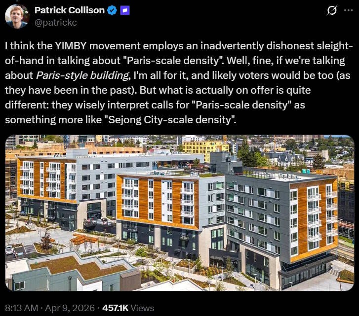 Patrick Collison’s YIMBY credentials are unimpeachable. He is a major backer of California YIMBY, the organization that has passed a stunning array of pro-housing bills in one of the most anti-development states in the nation. So it was interesting to see him claim that the movement has made a big mistake — or even been downright dishonest — by ignoring the aesthetics of apartment buildings: For reference, here’s Sejong City in Korea, whose residential districts do indeed look rather bland and oppressive: