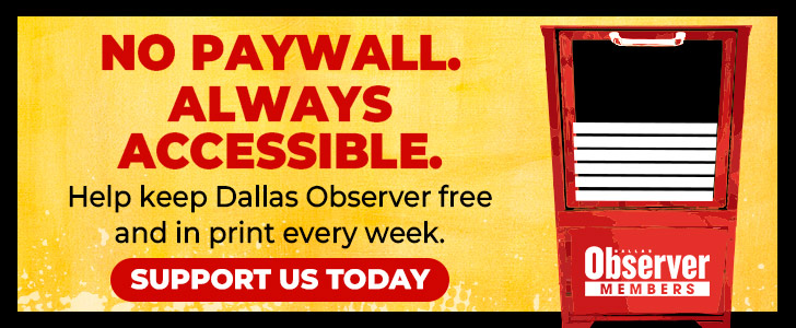 If Dallas Observer’s reporting matters to you, please consider supporting it today. Start a sustaining gift of $10 per month and help keep Dallas Observer free, accessible, and in print every week. |