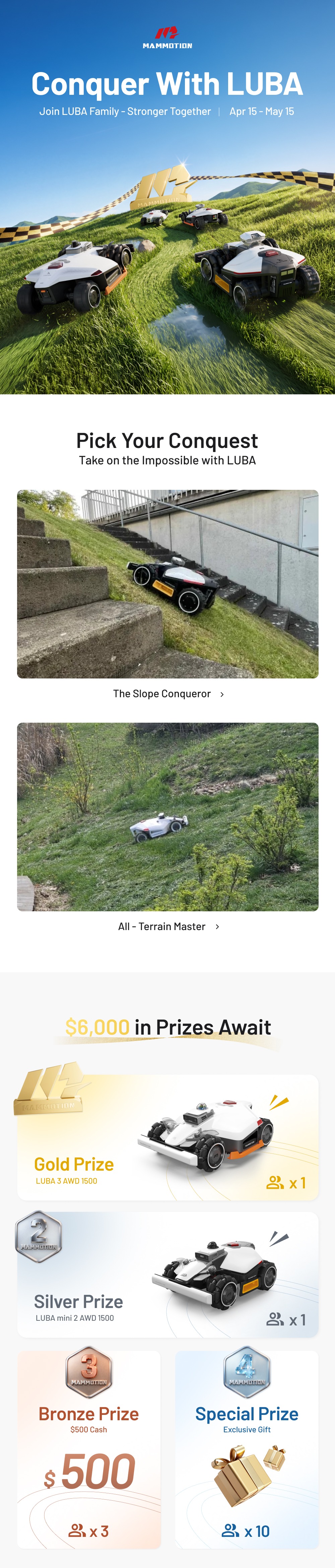 • Tag and follow Mammotion on FB/IG/TK/YT/X, and share your post with #ConquerWithLUBA