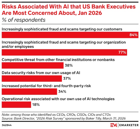 Key stat: US bank executives are most concerned that AI will enable increasingly sophisticated fraud and scams targeting both their customers and their organization/employees, according to a January 2026 survey from Bank Director sponsored by Baker Tilly. | | | |