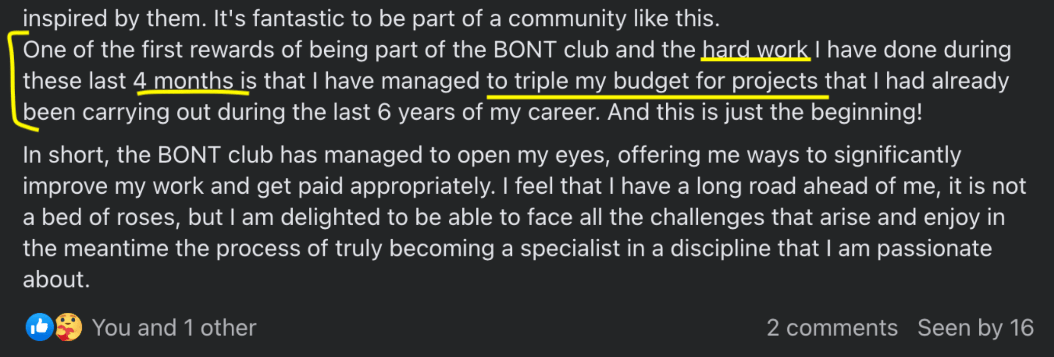 Hey , Miguel had been freelancing for 6 years. He had training, experience, and a decent client flow… but his rates? Flat. Every project felt like a grind for too little. Same effort, same budgets, year after year. Then he found the BONT Club and decided to bet on himself. Just 4 months in, here’s what he said: He didn’t work more hours. He didn’t magically become more “talented.” He just shifted his strategy, mindset, and how he positioned his value. Now his work is more profitable, his taste is sharper, and he’s finally feeling proud of the business he’s building. So if you’ve been at it for a while and still feel like you’re undercharging or playing small… maybe it’s time for your own shift. |