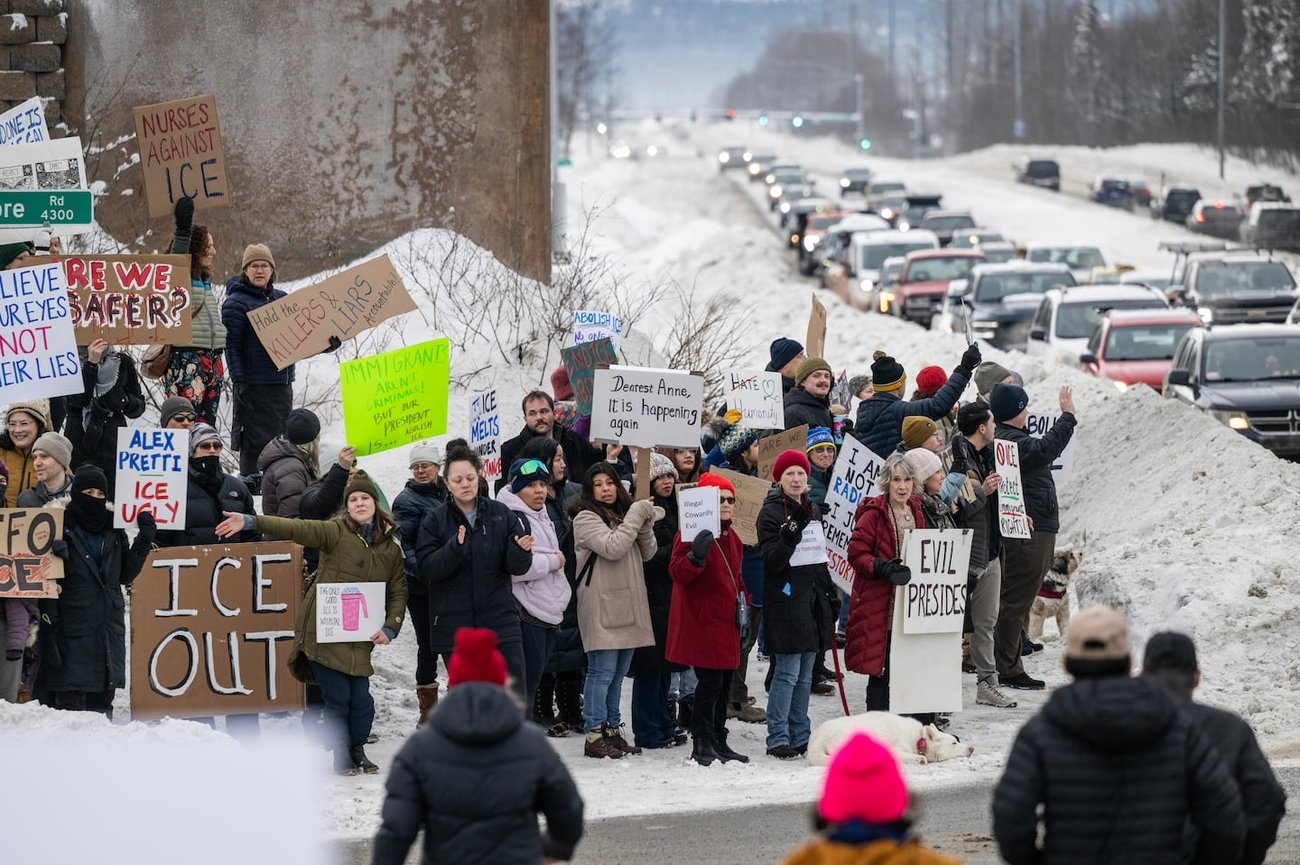 Two grassroots protests in Anchorage together drew hundreds of participants on Friday to decry the actions of ICE officers and the Trump administration's deportation campaign in the U.S. Health care workers say they were galvanized to speak out after federal agents shot and killed intensive care nurse Alex Pretti in Minnesota.