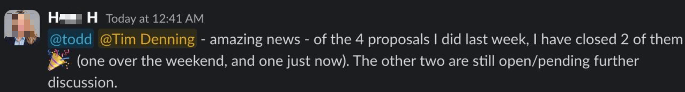 I’ll keep it short and raw today. Winners win. Losers lose. If you are a winner, you will continue to win. If you are a loser, you will continue to lose. And I’ll get yelled at for this, of course: “That’s bullsh*t, tone-deaf, politically incorrect hustle p0rn, Tim!”* I’ve made my peace with that. Because typically that screaming comes from the loser category. “Winners win. Losers lose.” It’s not elitist. Know why? Because all you need to do to get in the winner group is decide you are a winner. That’s it. Winning is a mindset, not a privilege. You aren’t born into winning. (How many rich losers do you know?) It’s not genetic. You can’t inherit winning. You choose it. Like this person: Who might literally close 4 of 4 proposals in 9 days. Or this person: Who took a “no” and turned it into a different “yes.” Or this person: Who went: